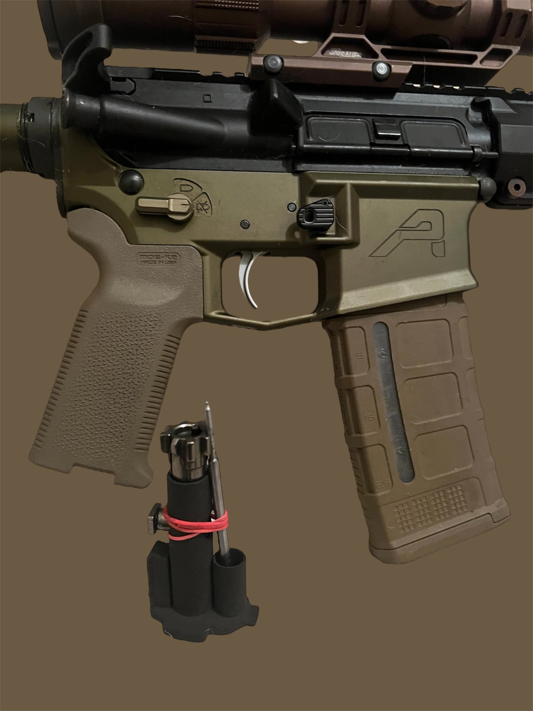 Simple and easy way to store a spare bolt, Cam pin, and firing pin in your Magpul grip. Stays put even under heavy abuse.